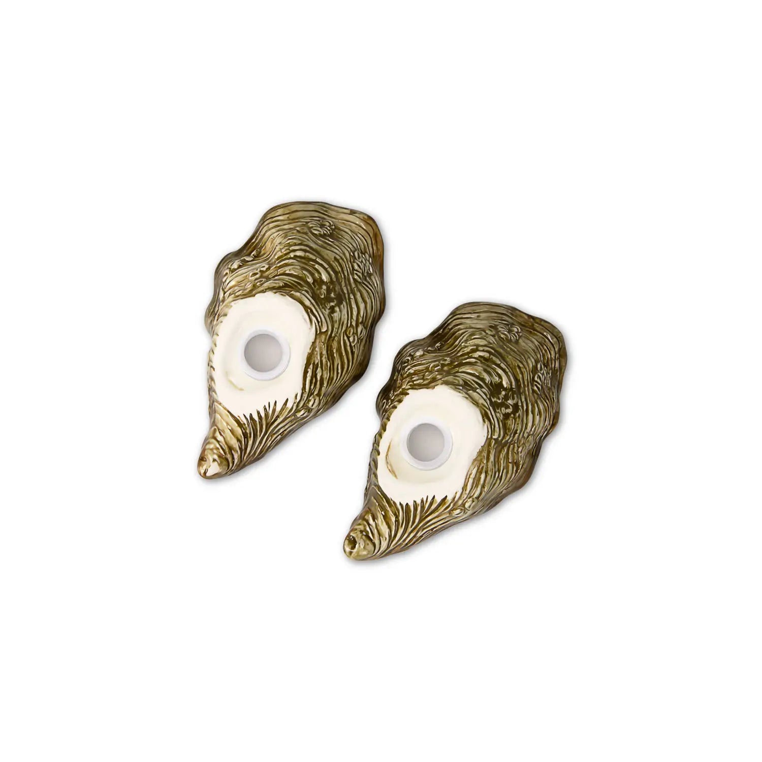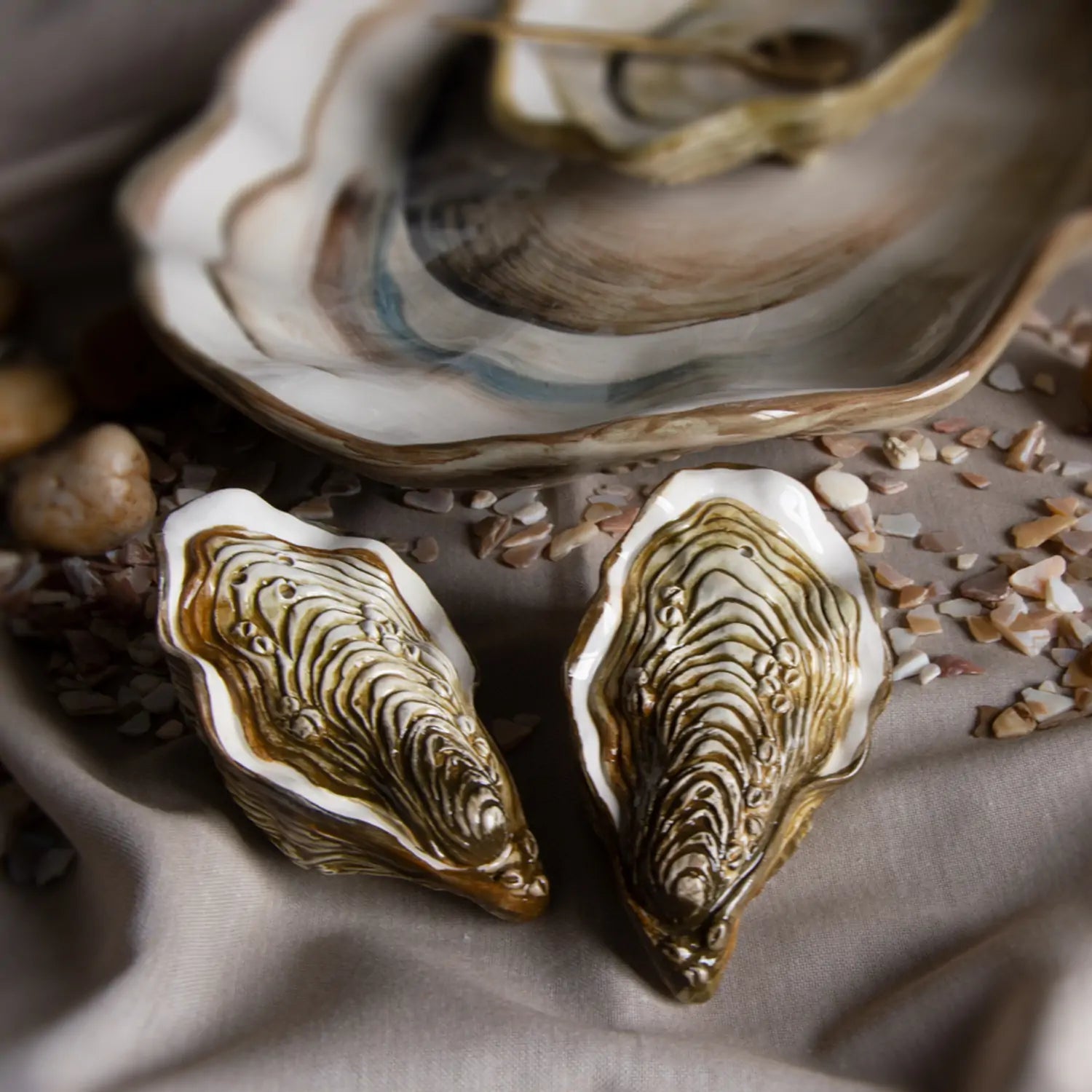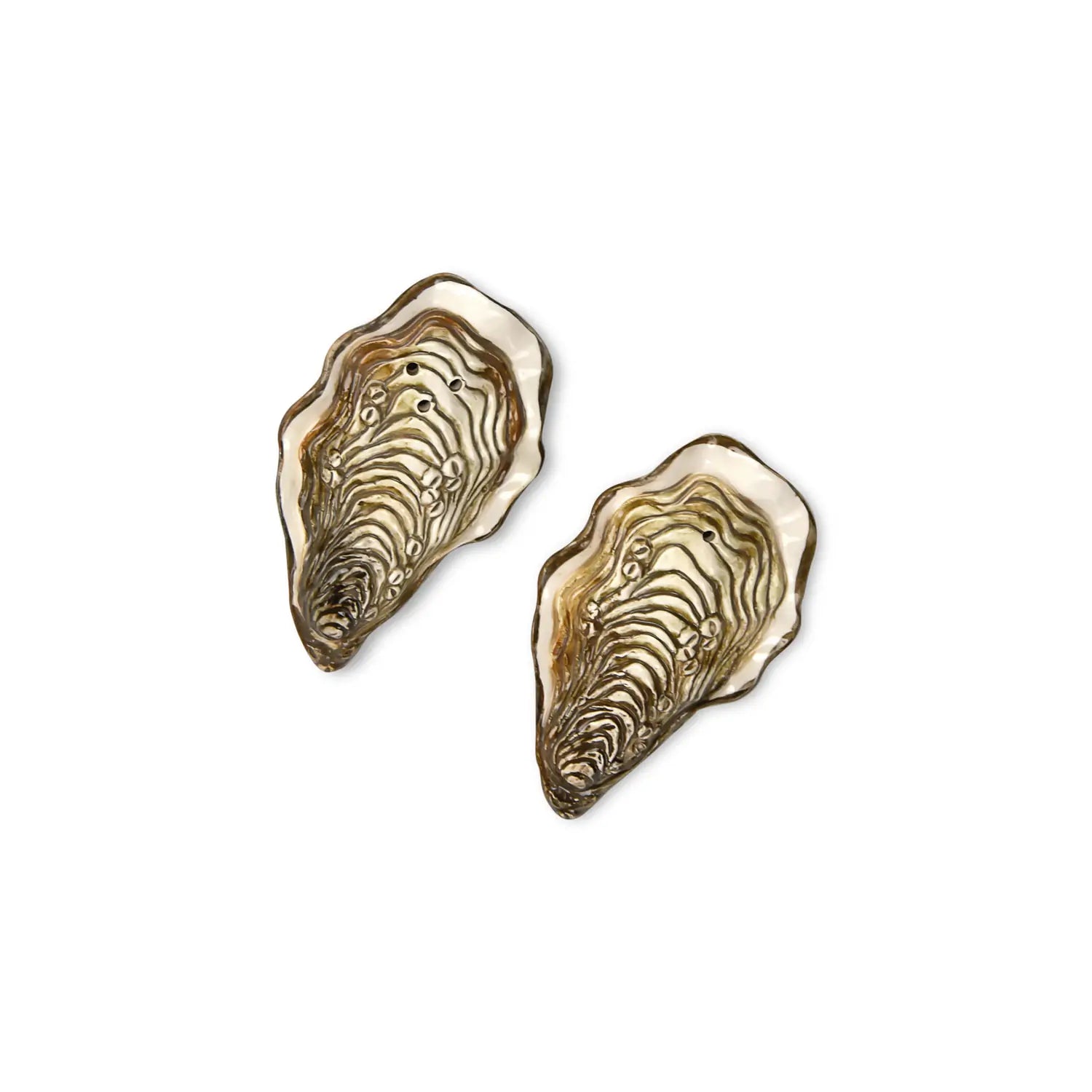 Set of 2 hand-painted ceramic salt and pepper containers in the shape of oysters. Light brushstrokes enhance the oyster shapes, giving a highly realistic effect.